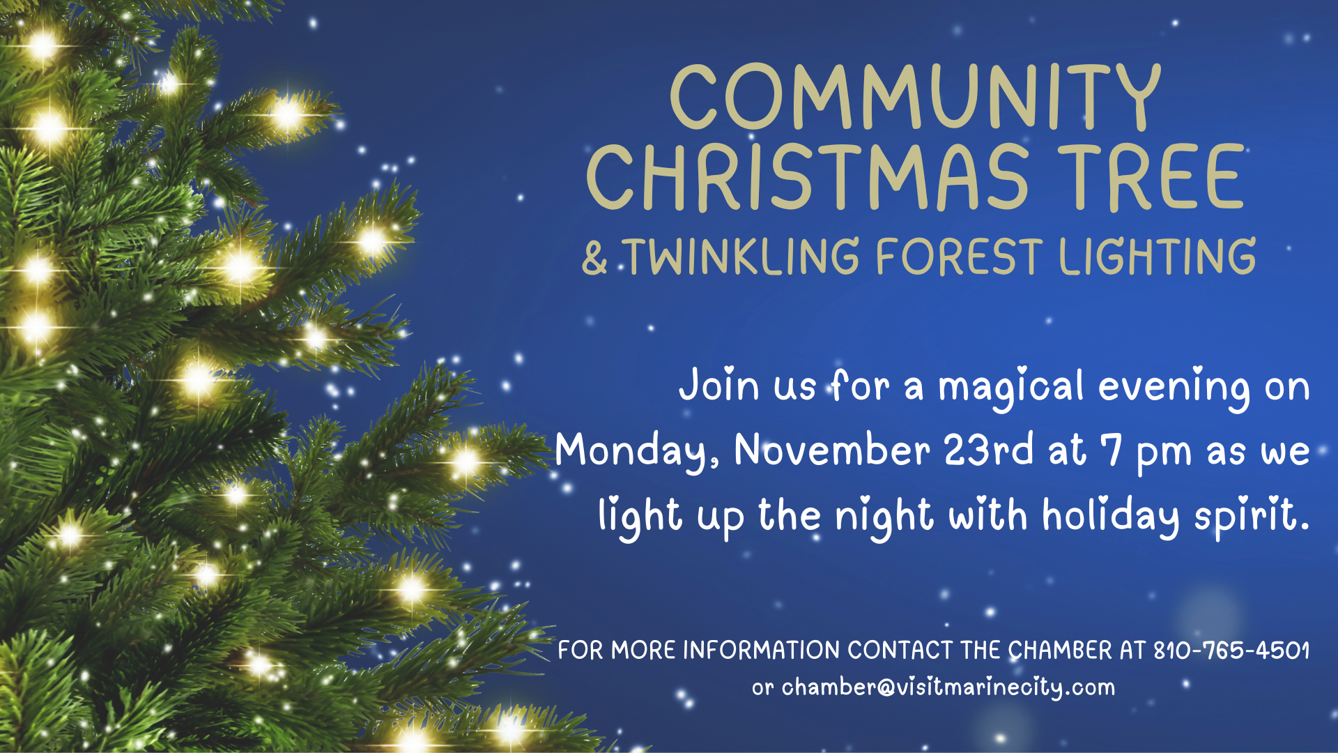 Become part of the TWINKLING FOREST! Our goal is to display over 100 twinkling trees to create a forest of lights that will be an attraction for residents and visitors. Thousands of visitors drive the Christmas Light Tour from Port Huron to Algonac each year. Now Marine City will add to this magical experience with our amazing Twinkling Forest, decorated homes and illuminated downtown.
